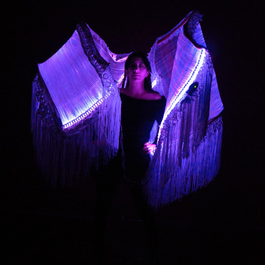 “Mientras trabajo con herramientas simples y rudimentarias como listones, huesos de llama, fibras de animales hiladas a mano y tintes naturales, utilizo para tejer materiales inusuales para el textil andino tradicional, como fibra óptica, hilo conductor y cobre como sensores, etc. y en la estructura oculta de estos tejidos incluyo circuitos electrónicos, microcontroladores, sensores de movimiento o color, LED digitales, parlantes, programación en código, etc.