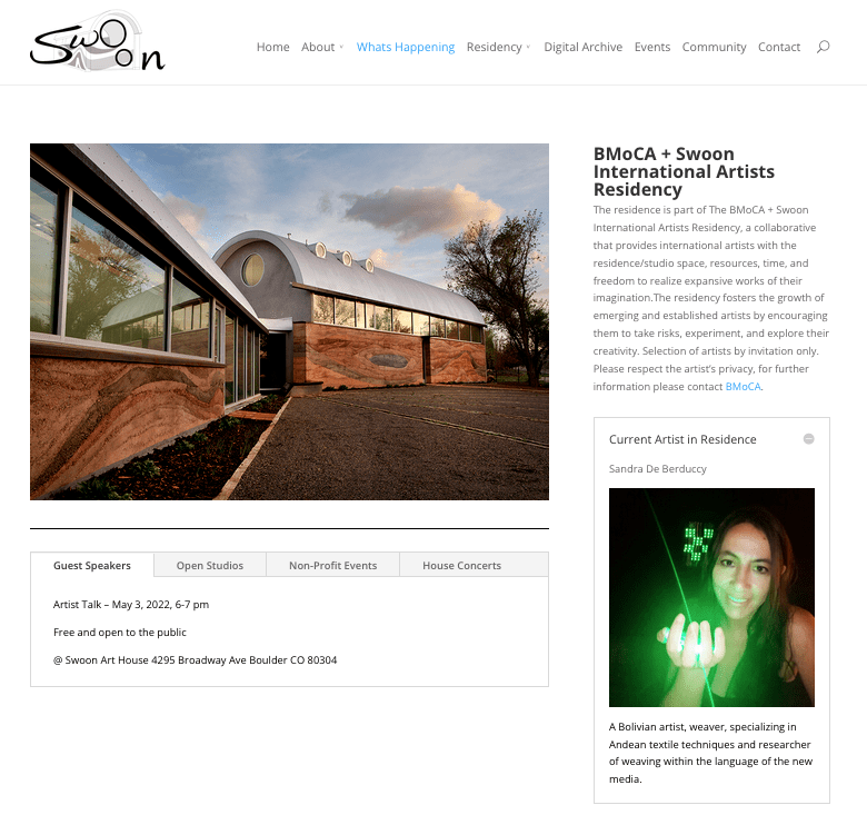Acerca de BMoCA + Swoon La residencia internacional de artistas BMoCA + Swoon existe para invitar a atistas de todo el mundo a explorar su práctica dentro de la comunidad de Boulder. Su objetivo es fomentar el crecimiento de artistas, músicos, escritores, bailarines y otros creativos emergentes y establecidos brindándoles el espacio de trabajo, recursos, tiempo y libertad para tomar riesgos y realizar obras expansivas. La residencia enfatiza la importancia de un intercambio de ideas significativo y de múltiples niveles y fomenta las relaciones de trabajo con las entidades locales. El resultado ha sido una colaboración interdisciplinaria entre las artes, la tecnología y las ciencias en la que los artistas residentes trabajan en estrecha colaboración con académicos, creativos y expertos en centros de investigación científica para promover su trabajo actual o desarrollar nuevos trabajos. Establecido en 2015, el programa ha recibido a seis artistas hasta la fecha.