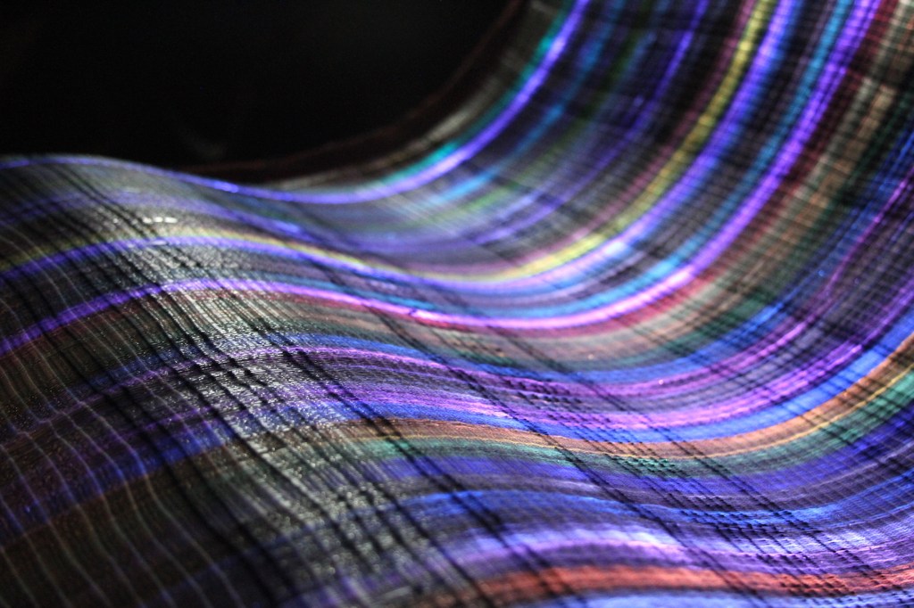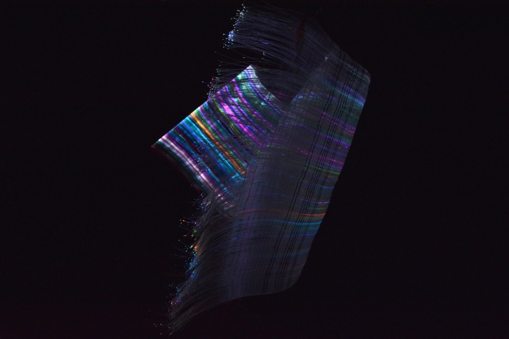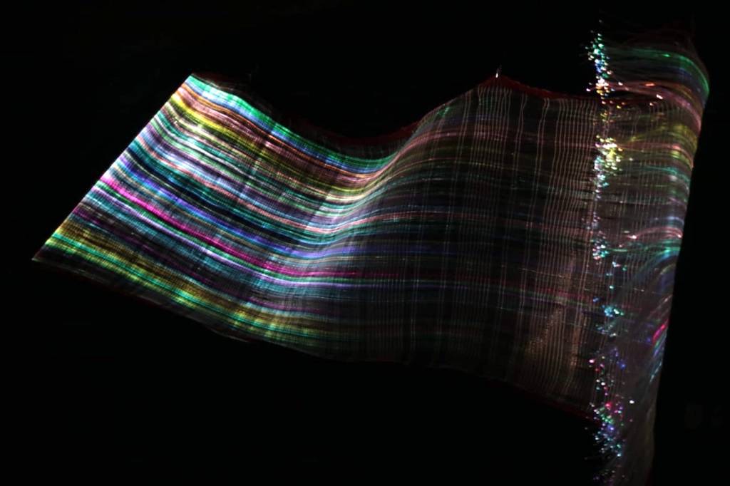In this work the optical fiber is woven with the loom and tools of the Traditional Andean textile. The colors that circulate through it, are like the color strips of the Andean fabrics, the same that remain transmitters of information of the origin of who wore it. Reminding us that light and color are the best and fastest information transmitters.