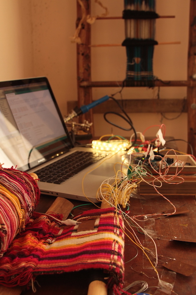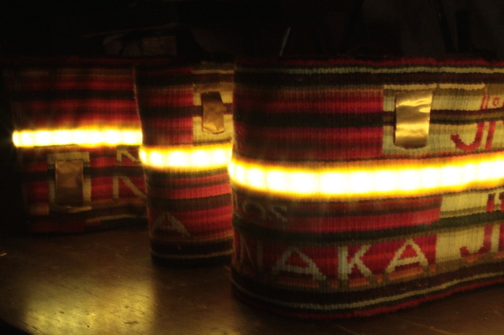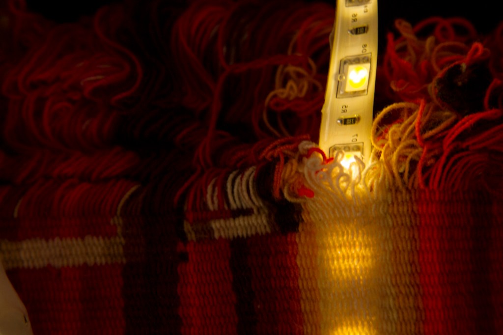 This fabric was worked on the traditional loom, with the double fabric or Kurti technique, and taking advantage of the characteristics of this technique, a matrix of 60 LEDs and copper pieces were inserted into its structure as sensors.