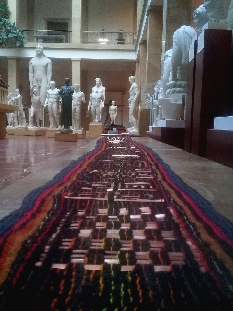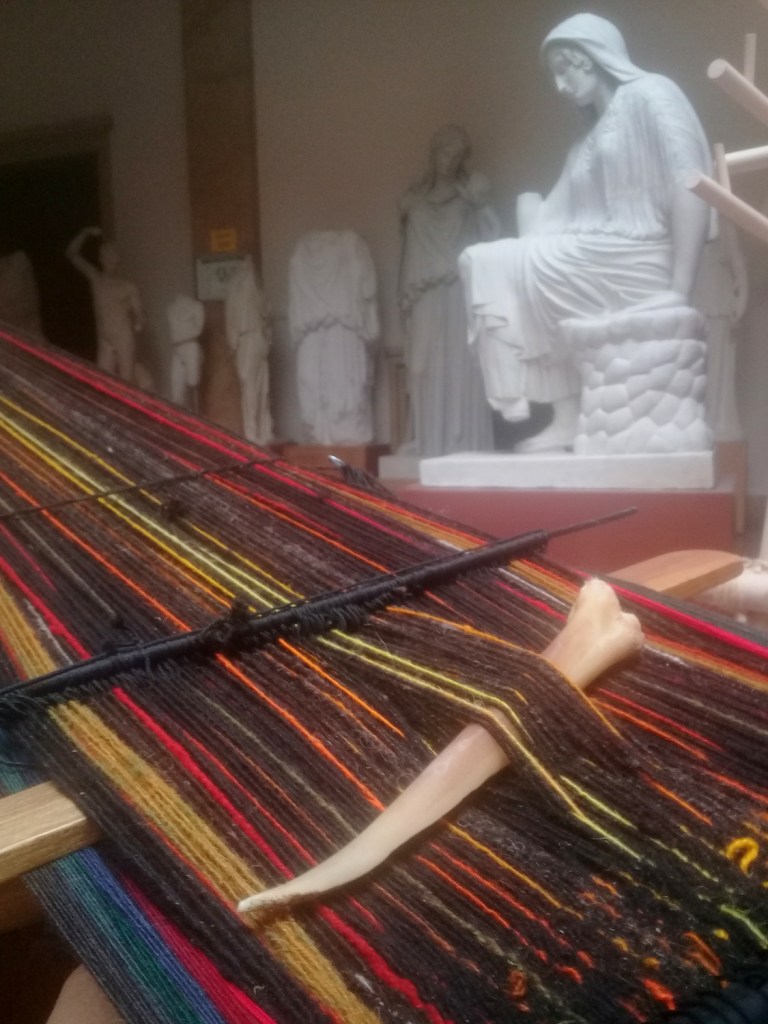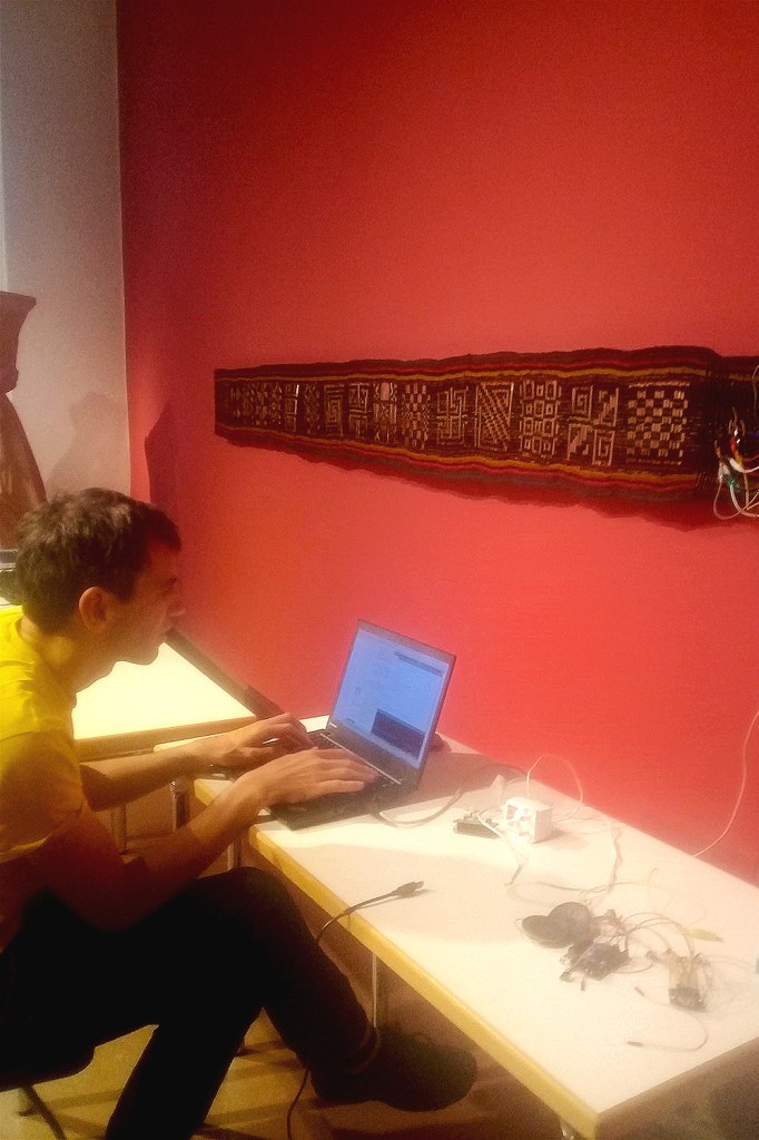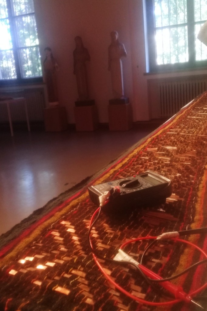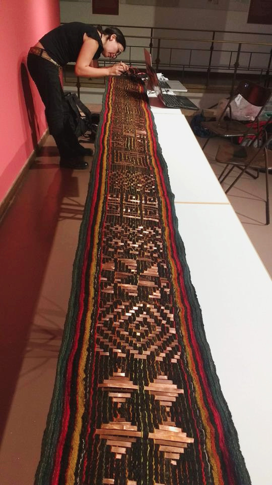 Tejido en telar de cintura. en su estructura fue tejido cobre, que al ser afectados con electricidad se convierten en sensores de tacto, Esta cercanía genera datos, estos datos son “traducidos” por un microcontrolador y son sonorizados según los patrones tejidos.