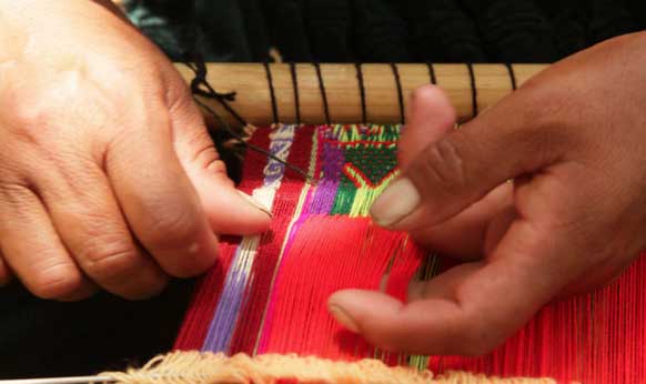 JIWASANAKA textil interactivo (40 x 180 cm ) Donde se tejieron los pronombres personales en aymara y castellano, resaltando la cuarta persona del plural en aymara, un plural inclusivo.