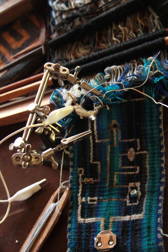 Obras textiles interactivas con técnicas y herramientas tradicionales andinas, entretejen tecnología prehispánica con la luz que circula por la fibra óptica.